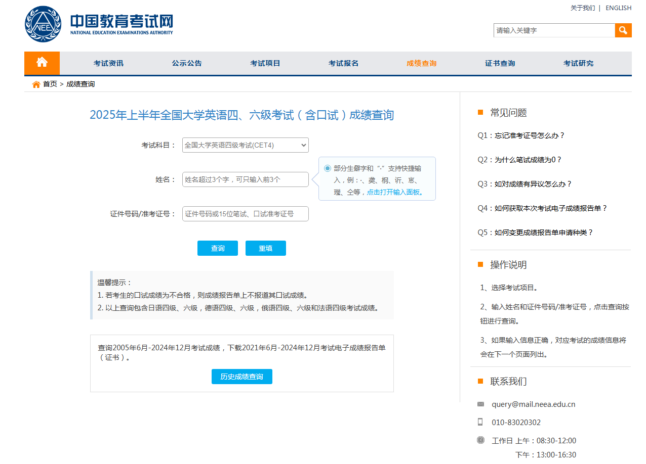 二、查询内容:2025年上半年CET全国大学英语四、六级考试成绩